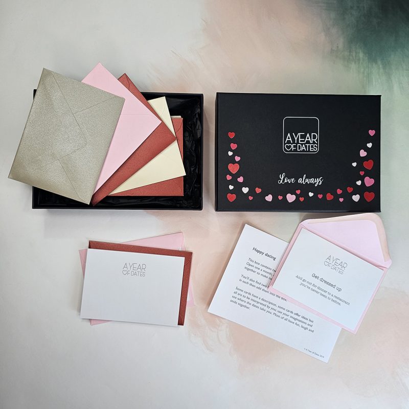 Inside the personalised black gift box you will find 12 colourful sealed envelopes, each containing a date idea. There are also two blank cards and envelopes for each person to write their own date, simply seal the envelope and add them to the mix