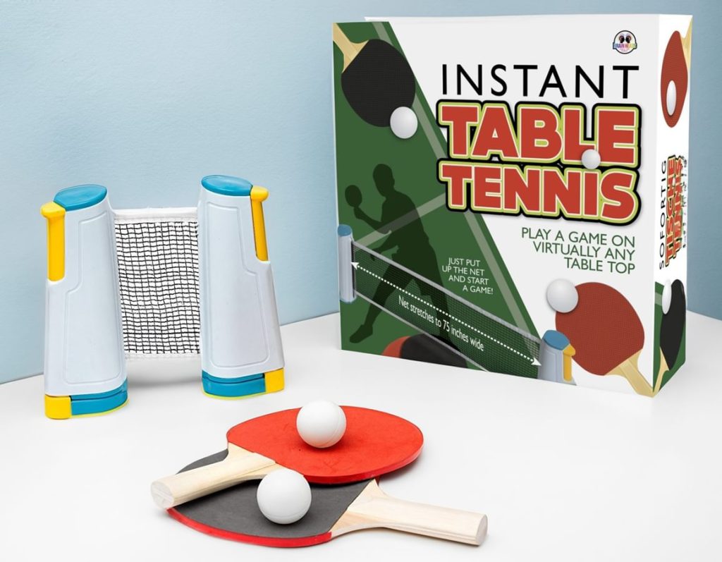 Comes with 2 bats, 2 ping pong balls and a retractable net
