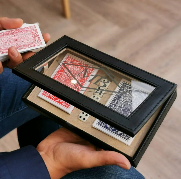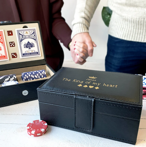 This personalised game set has two sets of cards and 5 dice