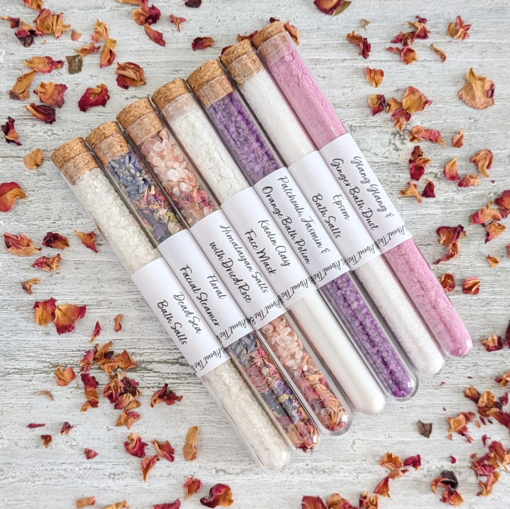 Contains Himalayan Bath Salts, Epsom Salts, Dead Sea Salts, Kaolin Face Mask, Bath Dust, Bath Potion and a Floral Facial Steamer