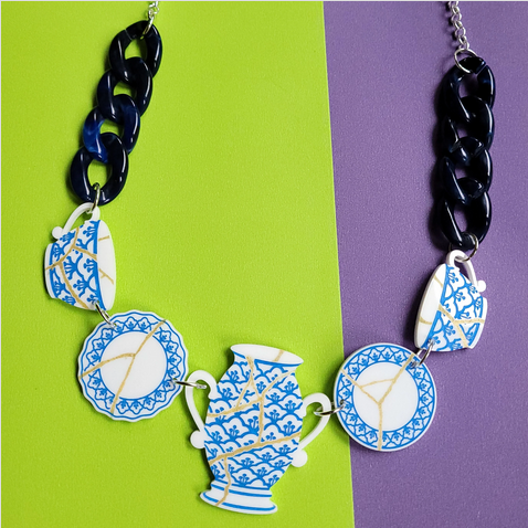 Kintsugi; the Japanese art of repairing broken pottery by mending the areas of breakage with urushi lacquer, dusted or mixed with powdered gold, silver, or platinum