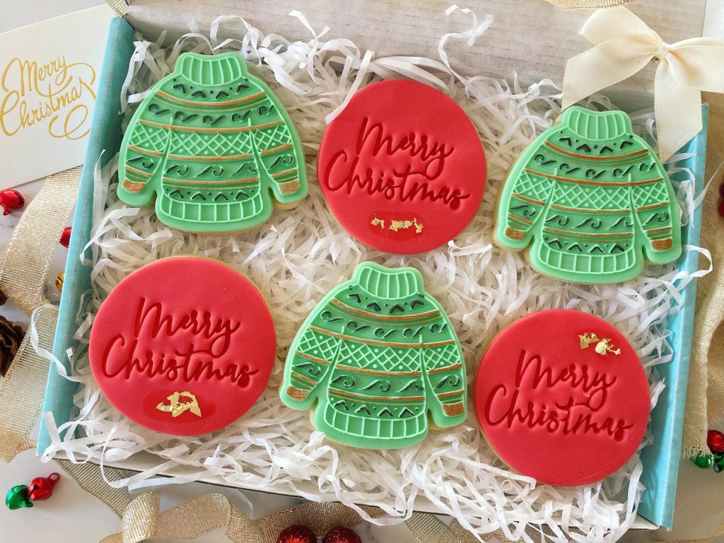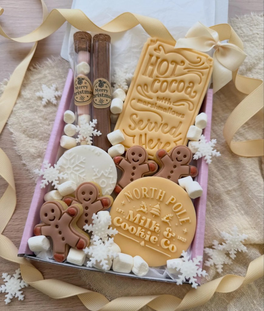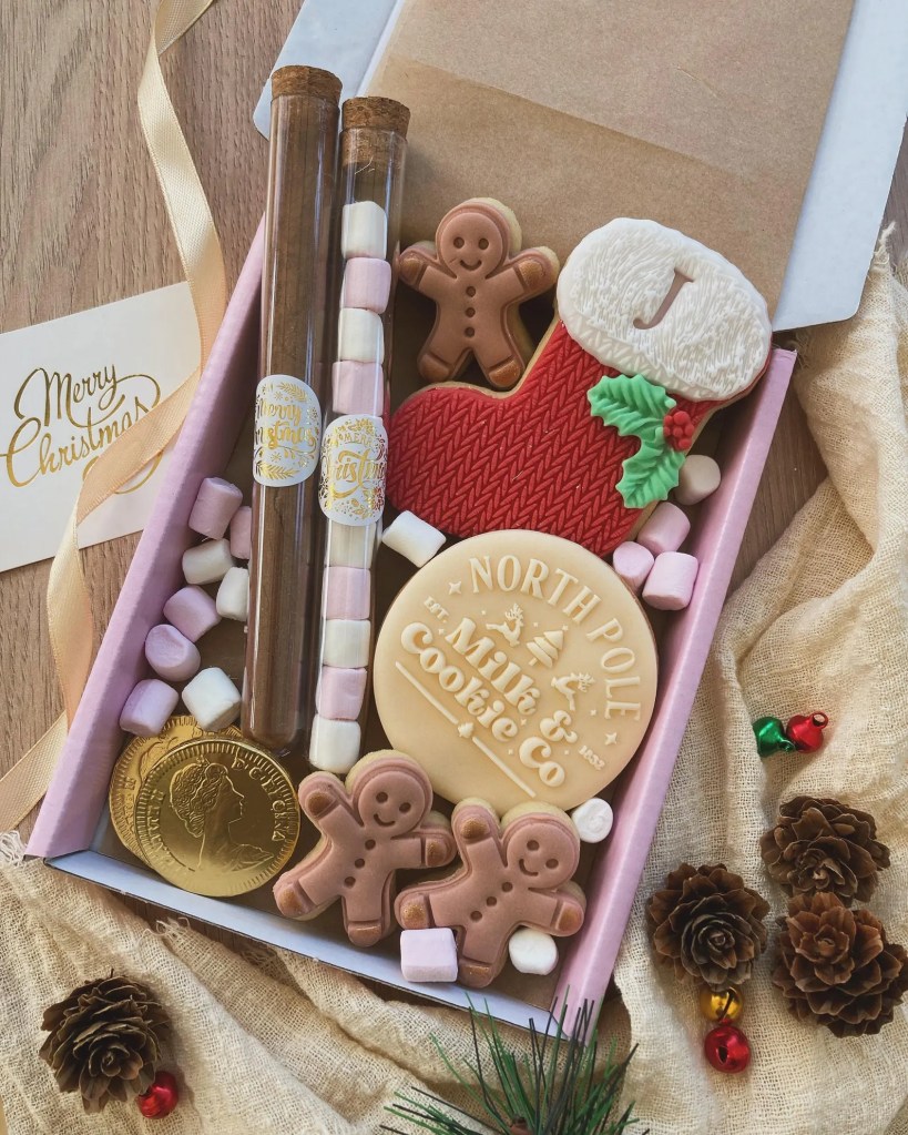 Contains a selection of decorated vanilla cookies and a tube of hot chocolate powder and a tube of marshmallows