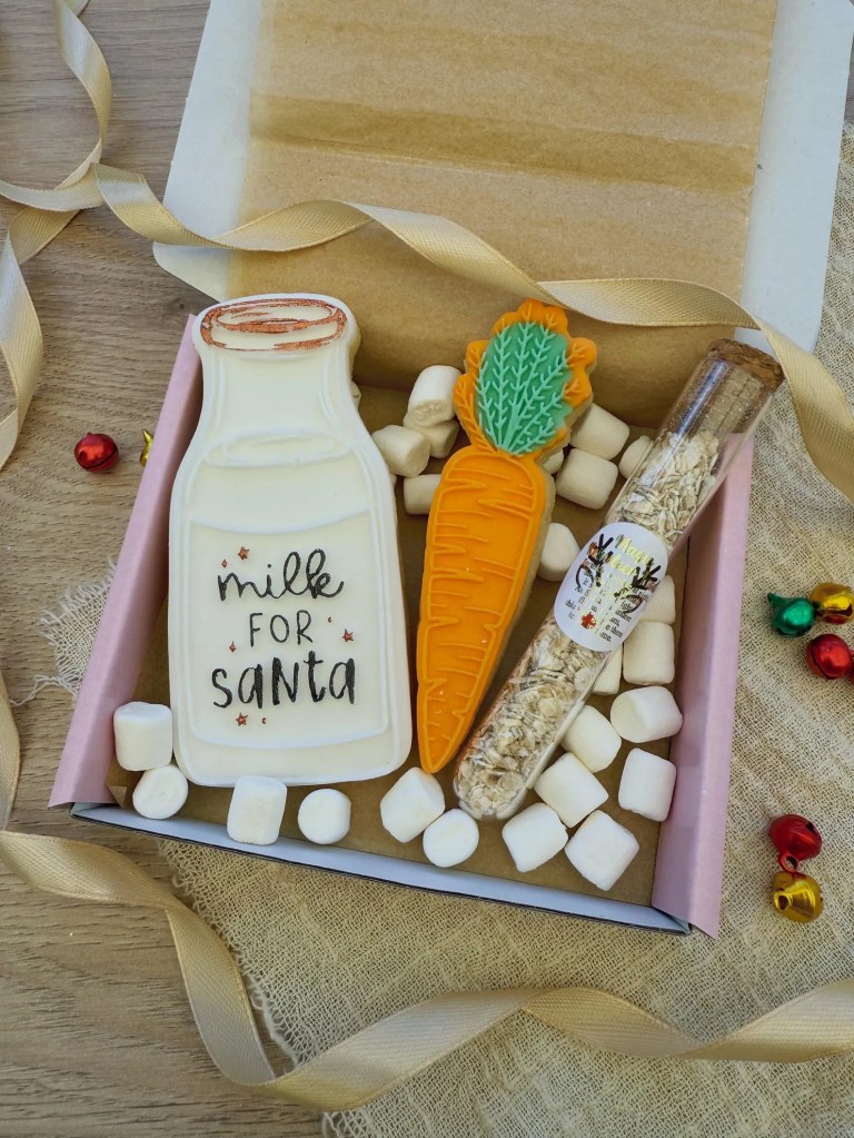 Contains a milk for Santa decorated cookie, a carrot for Rudolph decorated cookie and a tube of reindeer food with a reindeer food poem sticker