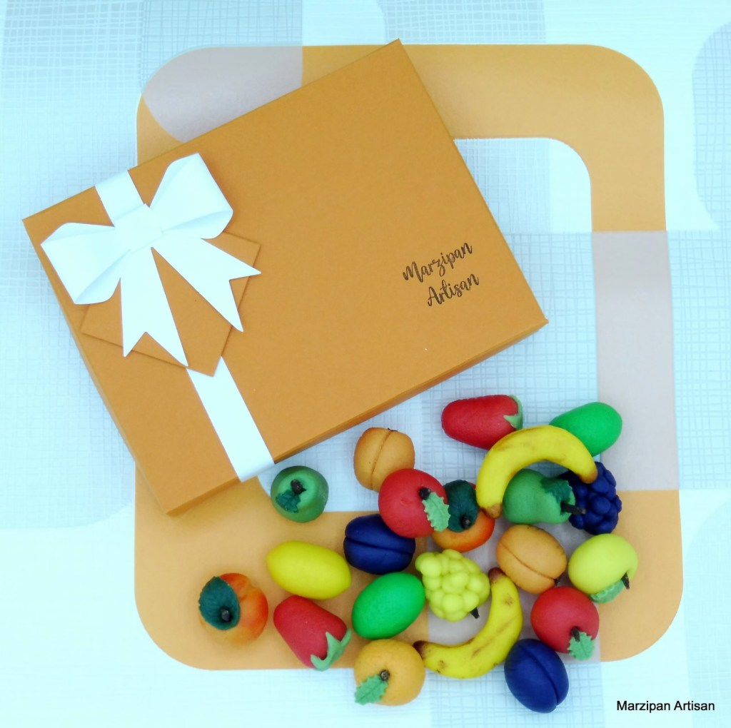 Box of 20 containing a mix of oranges, lemons, limes, plums, green grapes, purple grapes, strawberries, red apples, pears, bananas, green apples, peaches and apricots