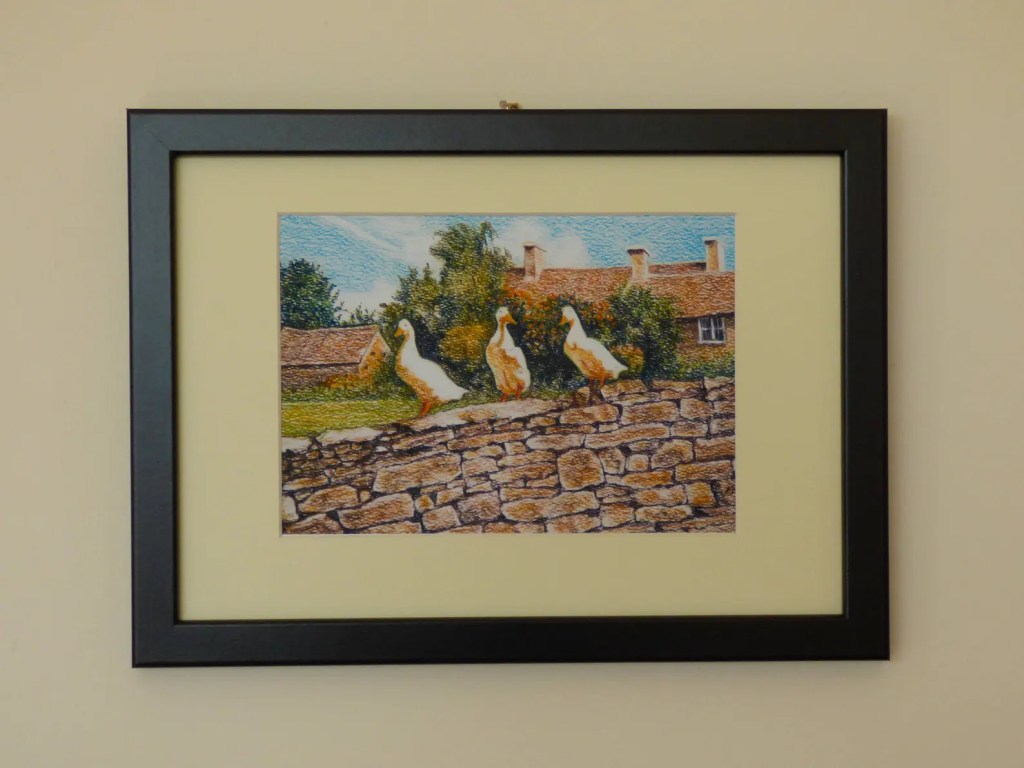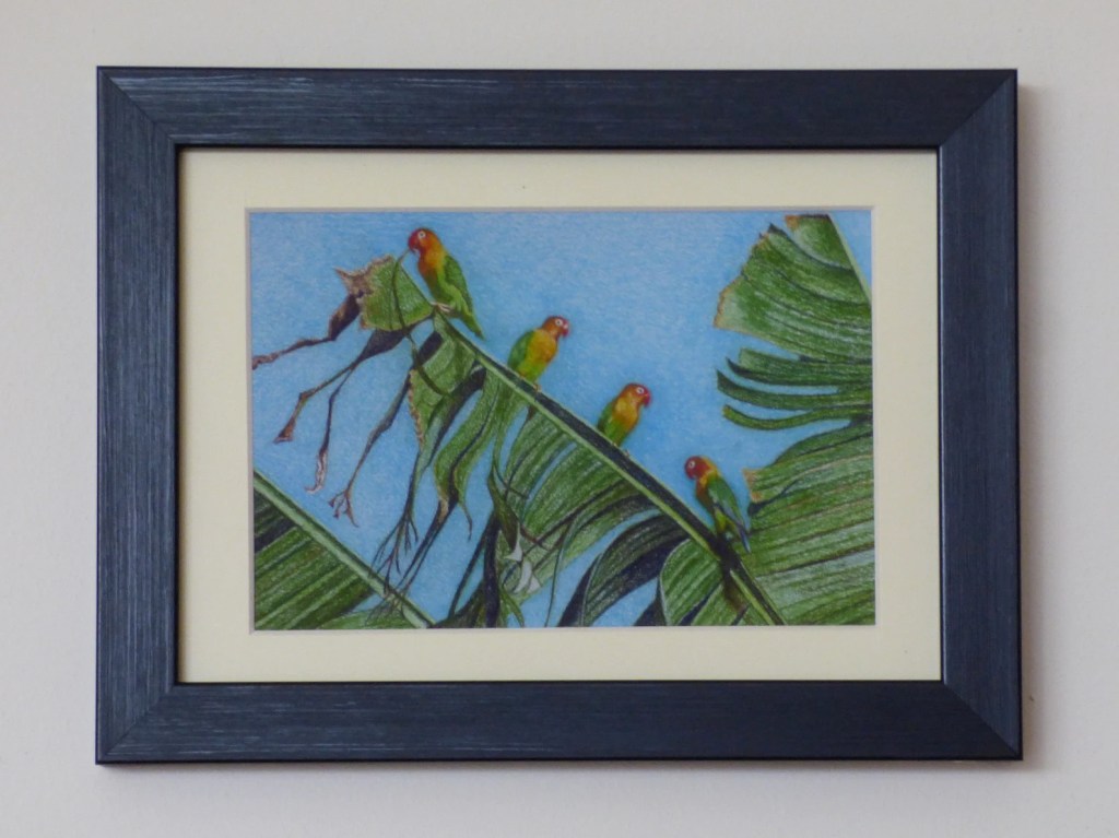 All artwork is done using pastel pencils on watercolour paper, and each drawing takes anything between a couple of days to at least a week, depending on the complexity. All prints come framed