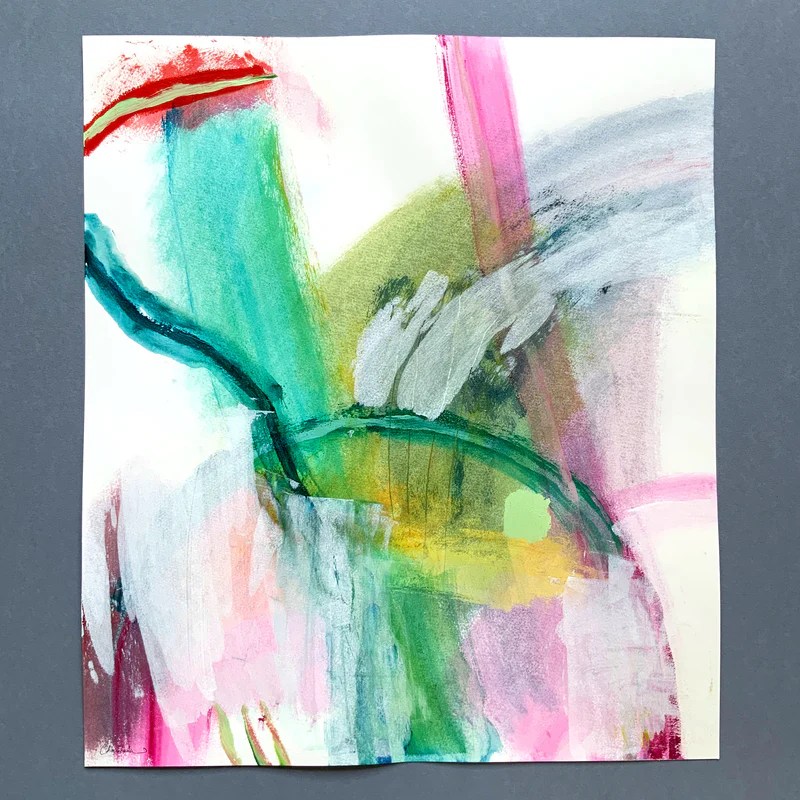 Whimsical Semi Abstract Floral Painting in Pink and Green