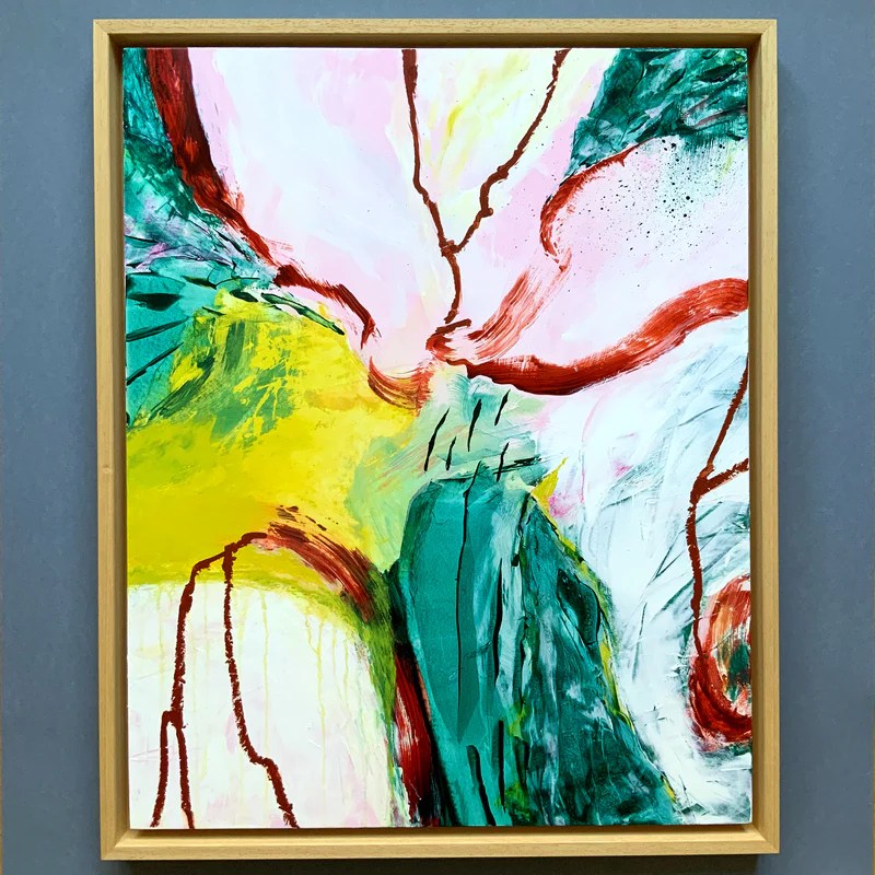 Measuring approximately 21 x 25 inches framed in natural Obeche wood. Acrylic on linen